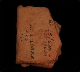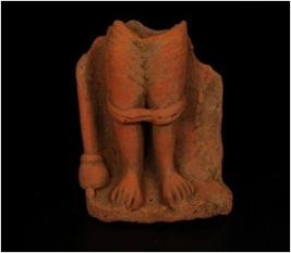 | Description / विवरण | terracotta lower portion human figurine, shown as wearing a dhoti-like garment upto knees. A garland-like decoration partly remained, fingers clearly shown and red wash treatment was given. |