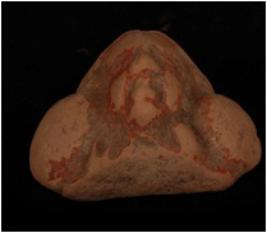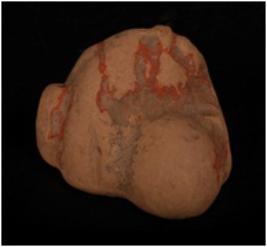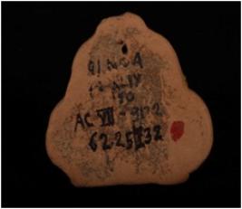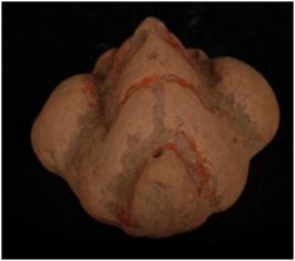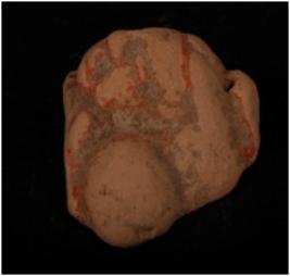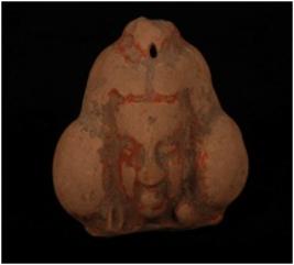 | Description / विवरण | Terracotta head with a lenticular eyes and raised circular dot on the forehead, broken nose, drooping lips, made with well levigated clay, well baked, traces of red colour found on surface. |