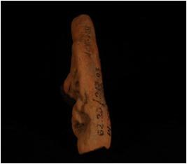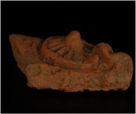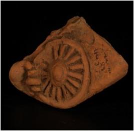 | Description / विवरण | A handmade well baked terracotta fragment of a round plaque, showing a chakra in hand. Made with well levigated clay and given a was treatment in red colour. |