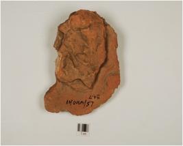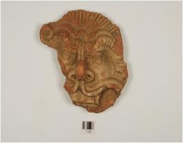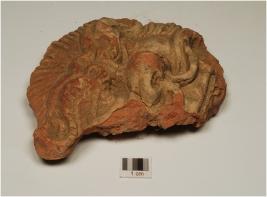 | Description / विवरण | Fragment of human face depicting prominent feature incised hair eyebrows, nose nostrils & mushtach & teeth treated with buff slip. |