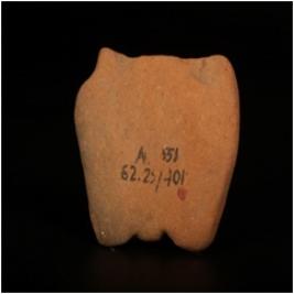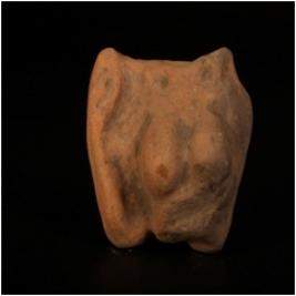 | Description / विवरण | Terracotta plaque of nude female bust, with prominent breast, headless, defaced feature, cruded, wash treatment was given in red colour. |