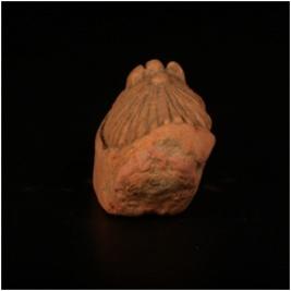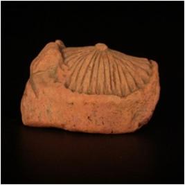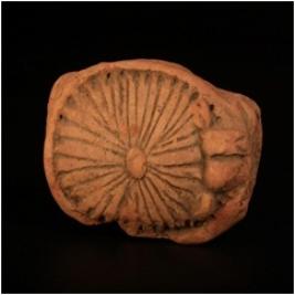 | Description / विवरण | Terracotta fragment of plaque showing a chakra hole in vishnu s left hand with doubled figurine inserted between this spokes, red in colour. |