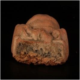 | Description / विवरण | Terracotta plaque of kubera deity, pot belly, intact feet, seated on wearing depery. Upper portion is missing, red in colour. |