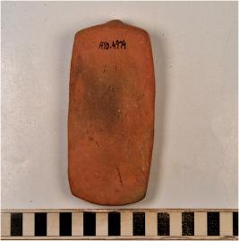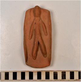 | Description / विवरण | A terracotta plaque showing human figurine prepared in applique form method, having with two eyes wearing neckless with two hands and two legs in standing posture. |