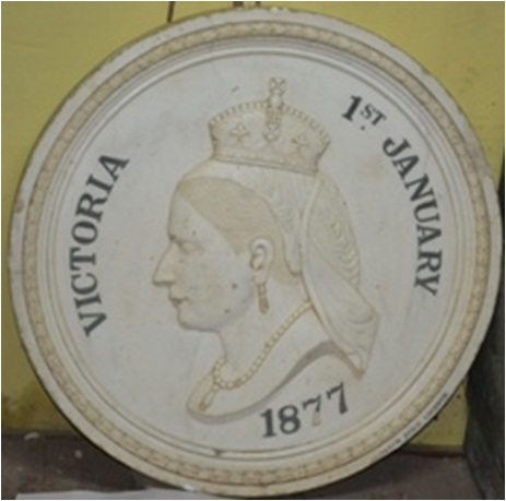 A marble plaque of queen Victoria belonging to Victoria bridge of Mandi. Head of queen is shown at the centre wearing crown and headdress. Her face is shown in profile. She wears necklace of beads and ornament. Victoria is written at the left and Ist January at the right and 1877 at the bottom. The back of the plaque is plain.