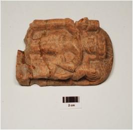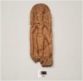 | Description / विवरण | A moulded terracotta male figurine on plaque probably deity figurine adorned with stylized headgear, angular eyes, prominent nose, raised eye brow slender waist wearing waist, band and drapery fold hanging between legs, four arms ancilliary hands holding some object., principle hand wearing armlet, with traces of chocolate slip, broken and mended. |
