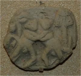 | Description / विवरण | A circular plaque depicts two monkeys in standing posture and holding each other. |