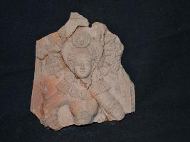 | Description / विवरण | A fragmented plaque depicting a yakshini with ten auspecious hairpins. She is ornamented with earings, bracelets, necklaces etc. |