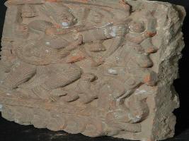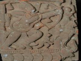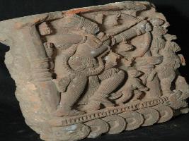 | Description / विवरण | The plaque depicts a war scene from Ramayana featuring Lord Rama and Hanumana on a chariot in fighting posture. He is wearing stripped Dhoti , ornaments and holding bow and arrow by both the hands. |