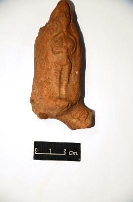 | Description / विवरण | Terracotta plaque depicting a standing female figure with folded arms. Facial features, ornaments and drappery are not clearly visible. Lower part of the plaque is broken. |