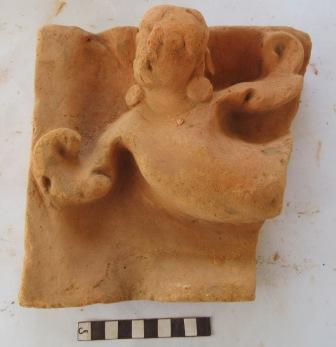 A terracotta plaque depicting flying figurine Gandharva, with arms like birds wing on both sides. He has round eyes, nose and mouth is broken. He wears karnakundala on both ears. Lower body part is broken. Both the wings are curling on the tip.