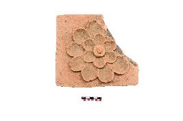 | Description / विवरण | This is a square shaped decorated terracotta plaque having carved with double petalled blooming flower and pistal is prominently seen. There is a slight broken part in the right side of the plaque. |