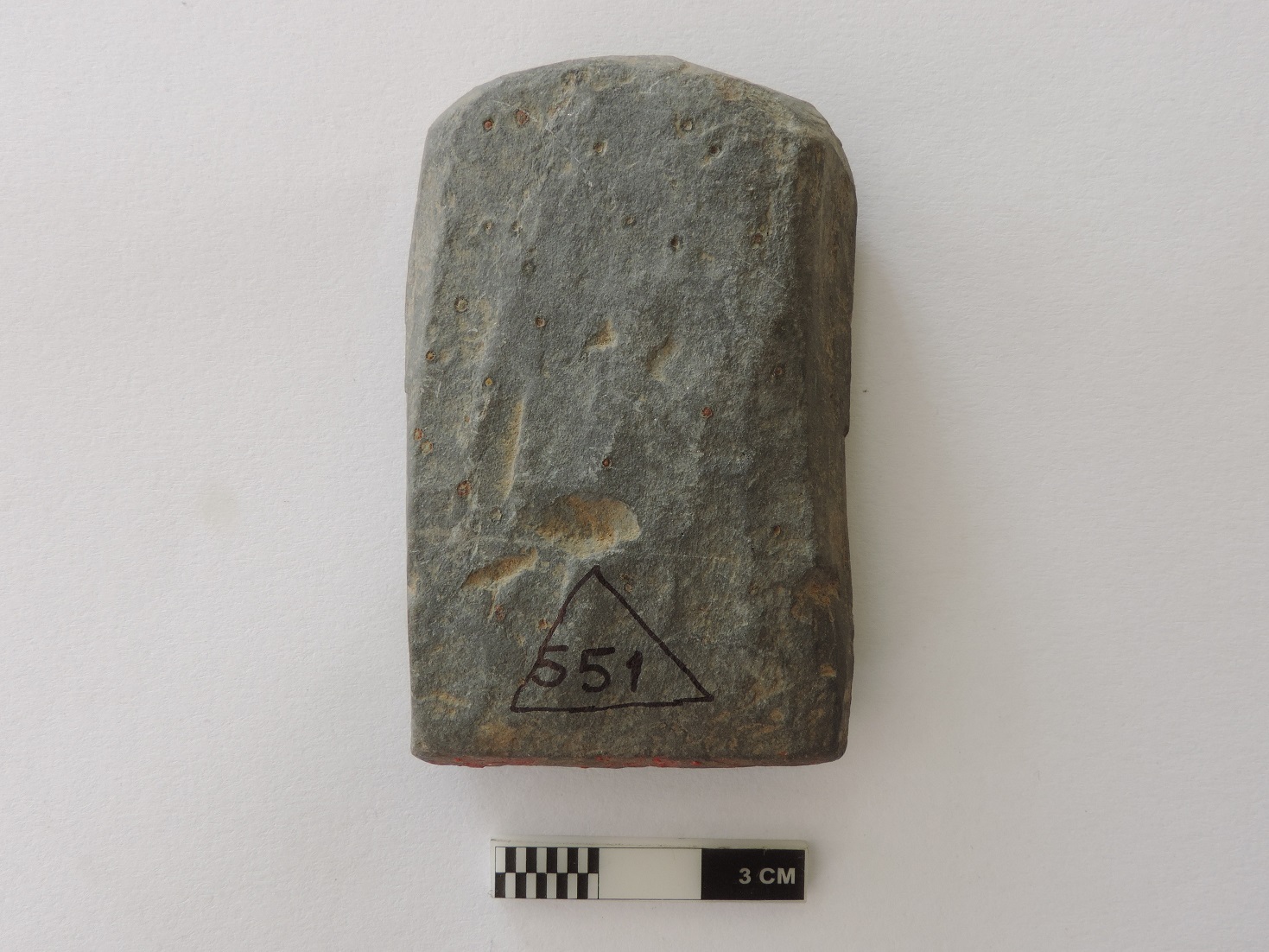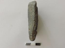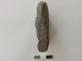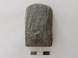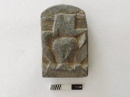 A complete specimen with the image of the Ganesa shown in a squatting position. The palms of the hands are kept on respective knees, trunk turned towards the left; right tusk extant (Ekadanta); the third eye shown on the forehead; pot-bellied with the udara- bandha shown by two close and parallel incised horizontal lines; the image wears a necklace shown by a pair of incised drooping lines below the trunk; the head is flat, no crown shown; the seat behind seems to have a petalled decoration.