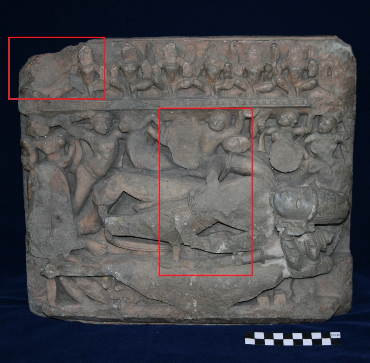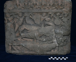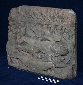 In present pannel Anantshayi Vishnu is depicted. He is shown laying on a bed, most of the facial features and other elements are chipped off. Vishnu is dipicted with two hands, wearing kiritmukut, and a dhoti. His hands are borken. A mace is show alongside of Vishnu, a figure is shown neae the feet of vishnu but it is totally chipped off. Verious flying celatial are also depicted hoding plateform of saptmatrikas. Facila fetures of these sapt matrikas are also chipped. partially damaged