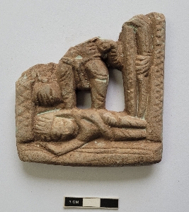 | Description / विवरण | A stone plaque ,features two human figures inside a rectangular shaped niche.One figure stands with bent legs over another reclining figure..A vertical pillar or architectural element is present to the right.The standing figure is holding an elongated vertical object with the left hand.The reclining figure lies with one arm bent under the head, Both figures wear garments. The upper portion of this panel is broken and missing. |