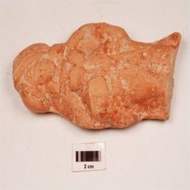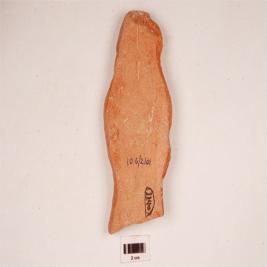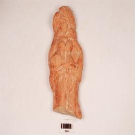 | Description / विवरण | Terracotta female figurine on plaque broken at foot portion head decorated with headdress, ear rings an necklaces visible, two prominent breasts, holding something in right hand, flowing drapery, red slip. |
