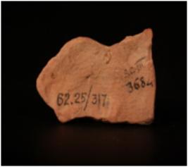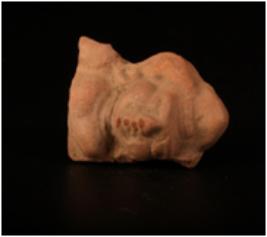 | Description / विवरण | A fragment of terracotta female bust with bun shaped headdress and incised necklace with angular eyes, slit mouth and pinched out nose and given a slip treatment in buff colour. |