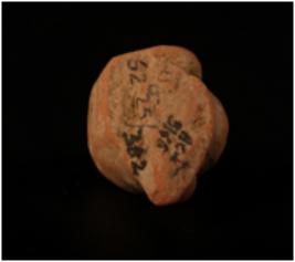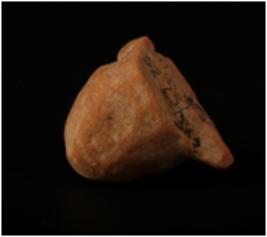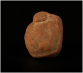 | Description / विवरण | A terracotta human head with bun shaped headdress and given a wash treatment in red colour. |