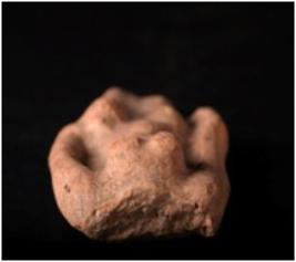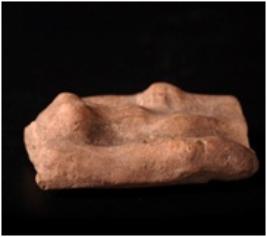 | Description / विवरण | Fragment of terracotta female figurine in plaque with circular breast, left hand resting on thigh and red in colour. |