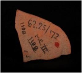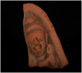 | Description / विवरण | Terracotta fragment of male head on a thin plaque with improminent eye, nose, lips, headdress and wearing ear ornament. |