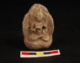 | Description / विवरण | Mould made plaque image of seated buddha on lotus throne in padmasana posture right palm near the chest is broken, left hand rests on lap holding an unidentified object in hand. The decorative motits of the back ground not clearly visible, ill fired. |