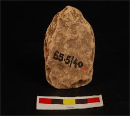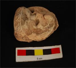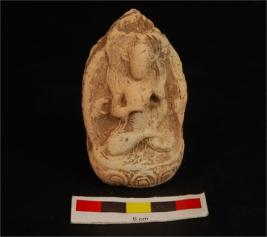 | Description / विवरण | Mould plaque image of seated buddha, features are eroded, crown is broken at the top end. Flowing garments, padmasana posture on a lotus throne, right hand near the chest and left hand holding unidentified object resting on lap, ornaments on waste and neck. slightly chipped off on top part, ill fired, coarse tempering material used. |