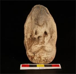 | Description / विवरण | Plaque with seated deity, mould made, with fine clay in terracotta, surface has wash in buff colour. Daity is in padmasana, holding a disc, lotous pedastal with minute details of draparies. |