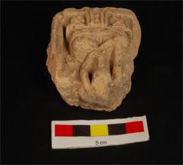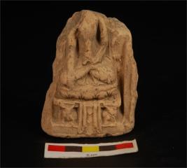 | Description / विवरण | Plaque headless buddha image sitting on louts throne in bhumisparsha posture folded legs and right hand touching the throne . Left hand holds an object, traces of ornaments on the chest visible. The base of the lotus have a platfrom with two elephants support and a rectangular on the plaque, back ground of image decorated with creepers. |