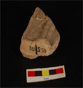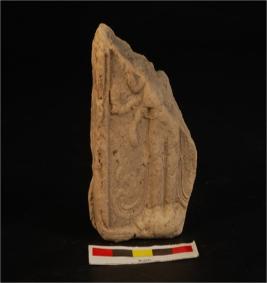 | Description / विवरण | Mould made figure on plaque standing on lotus, right three hands visible with objects in hand, part of garment flowing down, ill fired. |