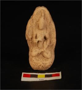 | Description / विवरण | Mouldmade clay plaque, partly broken, diety is dipicting in standing position with greeting posture. Jewelled crown, three arms are visible. Decorated edges. Floral design on reverse side. Sun dried. |