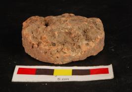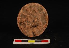 | Description / विवरण | Terracotta plaque, round in shape, flat base with incised human figure on oeverse side. Uneven and roughness on obverse side. Groove is visible and black stain on reverse side. Red in colour. |