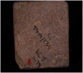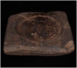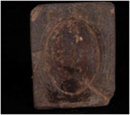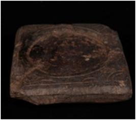 | Description / विवरण | A small plaque, made on stone, smooth surface on both sides, a circular design on one side. Square in shape. Broken at one corner. |