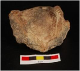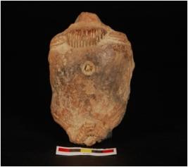 | Description / विवरण | Handmade terracotta plaque fragment of diety. Waist is visible. Proper jewelled with necklace and wasit band. Lower and upper portion is missing. Jewellery is decorated with incised lines. Neval is suggested by hole. White and black stains are visible on surface, painted but flaked off. red in colour. |