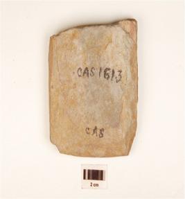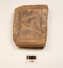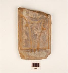 | Description / विवरण | A fragment of plaque made on stone, having indeterminate design or images on surface, which is suggested by grooved lines, partly broken, square in shape and flat surface. |