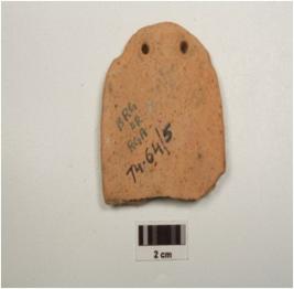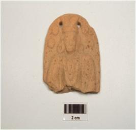 | Description / विवरण | Terracotta plaque depicting male bust, made on single mould, peculiar headdress, two perforations on top, wearing necklace and kundal s facial features not clear, wearing a head band on forehead floral design on back. |