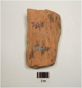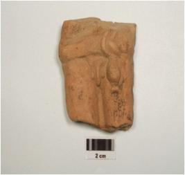 | Description / विवरण | Terracotta plaque depicting male thigh portion, made on single mould, prominent male organ and waist band on left side. |
