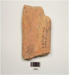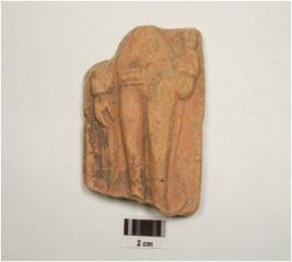 | Description / विवरण | Fragment of terracotta single mould plaque depicting standing female figurine, right hand lowered holding a ribbon and other hand akimbo, wearing bracelets, and a girdle of three strings, partly damaged surface drapery hanging at the back and missing upper portion. |