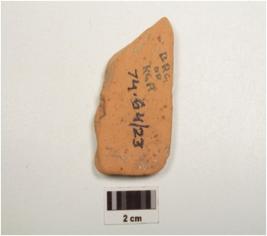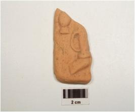 | Description / विवरण | Terracotta plaque depicting a leg portion, wearing anklet, drapery traces also visible and a ghat shape object on one side. |