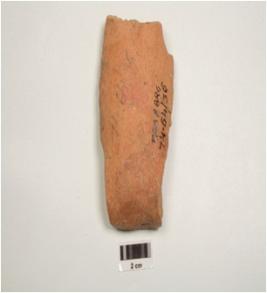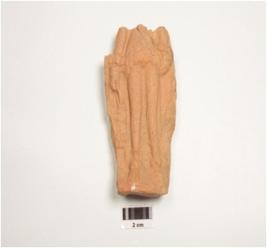 | Description / विवरण | Fragment of terracotta single moulded plaque depicting standing famale figurine, missing upper portion, right hand stretched down holding a bunch of flowers and left hand akimbo, wearing bracelets, bangles, anklets and a girdle, transparent drapery reaching the legs partly damaged surface. |
