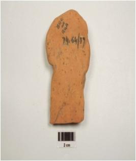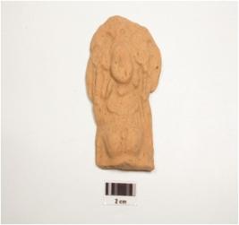 | Description / विवरण | Terracotta plaque depicting female bust, elaborate headdress with two applied rosettes are aslo pinned on both sides of hair-mass, wearing four necklaces and earrings, cruded facial features and prominent breast. |