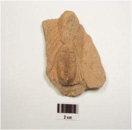 | Description / विवरण | Terracotta plaque depicting human face, elaborate headdress, prominent eyes and partly damaged face. |