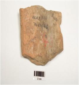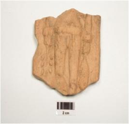 | Description / विवरण | Terracotta plaque depicting male figurine, made from single mould on left gardle knotted on left side, prominent male organ, holding in one hand a chauri and in other a bunch of flowers, wearing bracelets, incised lines with dots on the upper part to indicate his garment. |