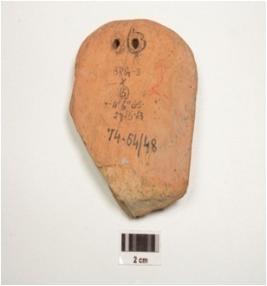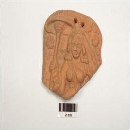 | Description / विवरण | Terracotta plaque depicting female bust Yakshi , two perforation on top, made from single mould, yakshi holding on umbrella in her right hand, wearing bracelets, arm lets, beaded chain, nacklaces, heavy ear ornaments, veil covered her head, dow on forhead, rich floral decoration on plaque and facial features very prominent. |