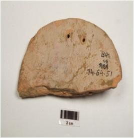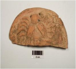 | Description / विवरण | Terracotta plaque depicting female face, made from single mould, elaborated headdress, decorated plaque, left side indicated a bird, prominent facial features and beaded chains on her forehead. |