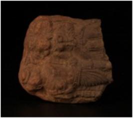 | Description / विवरण | Terracotta moulded fragment of dampati on plaque. Male wearing turban with knot and necklace. Female wearing stylised head dress and double necklace, incised eyes and nose. Incised decoration on drapery with ample folds and knot on girlde. Female wearing lower garment with prominent circular breast, thin waist, broad hips and left hand placed on waist. Ill fired, gritty clay with traces of red slip. |