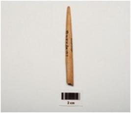 | Description / विवरण | A bone point with grains on smooth surface, one slightly broken pointed end, partly broken from other end, light brown in colour and rectangular in section. |