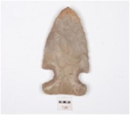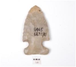 | Description / विवरण | A triangular bifacial arrow-head made of chert, barbed, projectile point and retouched edges. |