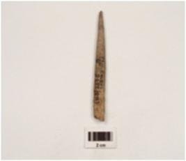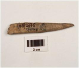 | Description / विवरण | Fragment of bone point with flat sides, tapering towards pointed end and other end is broken rectangular cross section, polished surface. |
