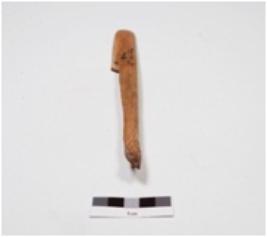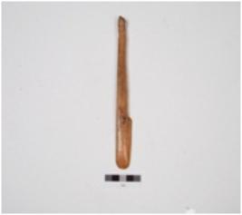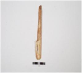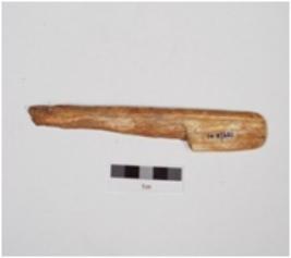 | Description / विवरण | A scraper made of bone, one side broken, sharp edge and well polished surface. |