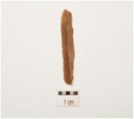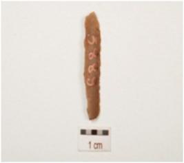 | Description / विवरण | Chert, parallel sided blade with a prominent ridge on dorsal side, both ends are broken irregular retouches on cutting edge and triangular in section. |